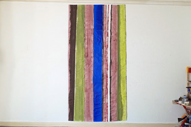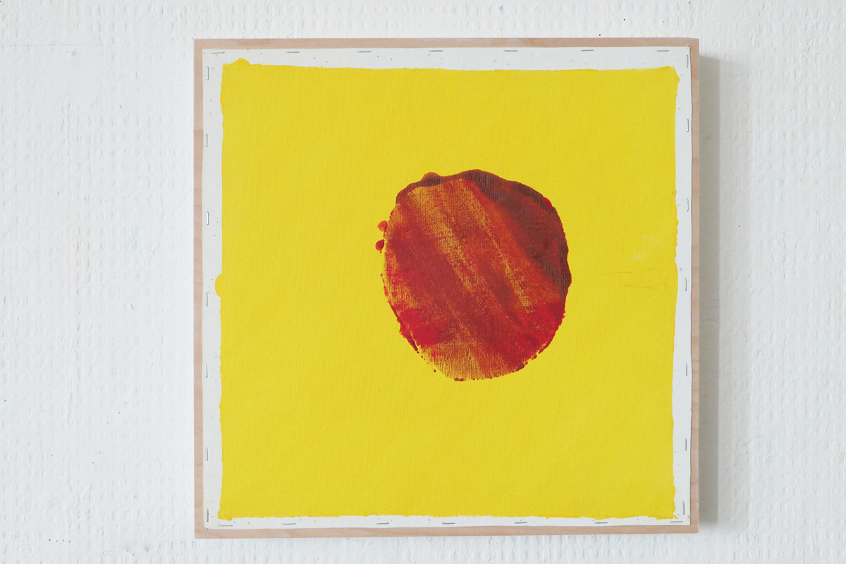 | The smell, 163x163cm (64x64"), acrylic on gessoed reversed canvas, and The form, already posted. Same size, same shape, same old brush, same method from right to left in stages starting from the upper right corner. The result depends on the making, not from a pre-established intention (image), but from the application of a fairly simple method. Overtake technique, go beyond skill. On the other hand the color has to be precisely prepared in order to hit properly the hue, density, luminosity and fluidity appropriate to the texture and shade of the canvas itself. Which means that this preparation (choice and qualities of the color) doesn't escape a form of imaginary projection, even if that requires numerous concrete tests. And colors are important as a perceptible manifestation of the existence of light. But if the light did not find a surface where it could crash and bounce, there would be no light and therefore nothing visible. The moon only exists for us because it reflects the light emitted by the sun. It is likely that the technique, which knows no limits because it is based on a language foreign to nature, would be able to make up for this lack by, for example, putting into orbit a procession of large lamps which would abolish the night. It would be another world, but it is conceivable. The whole thing being to know to what extent the production of non-solar light depends or not on the existence of the sun. Any student of physics could explain this to me very well and perhaps convince me, but if one should not speak wrongly and through, one should not either refrain from talking about what we don't know, it is the principle of the hypothesis. Here, it is a mixture of lemon yellow, cadmium yellow and primary yellow broken by adding a bit of soot black powder pigment so that the color doesn't rise in front of the medium, but blends in it, almost belongs to it. No longer arranging the surface using colors, but occupy space with color. The only noticeable difference, perhaps, between these two ones, is that i wasn't wearing glasses for Smell, so as not to be embarrassed by the detail, in order to remain focused on the overall perception of the space. |
